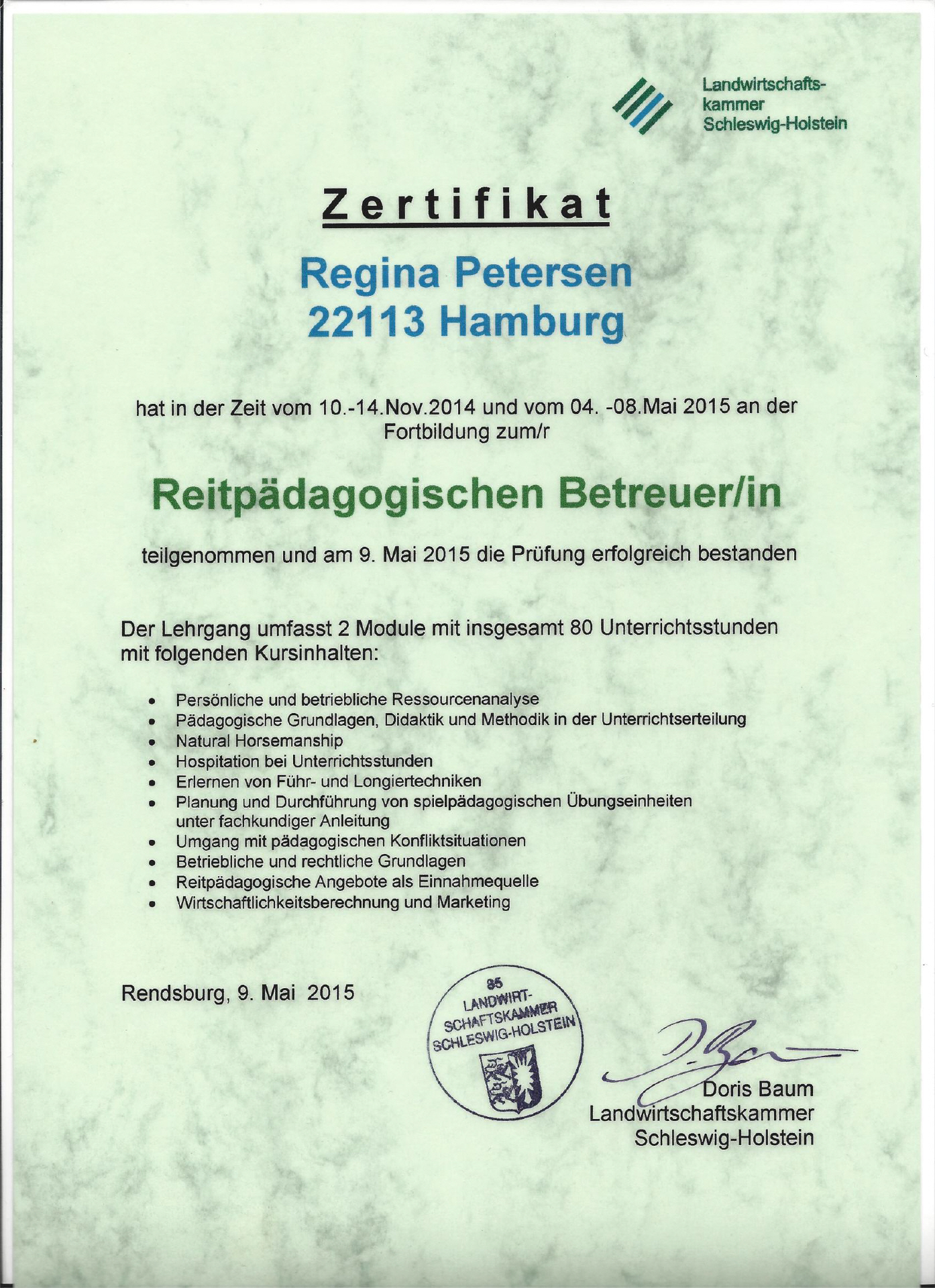 Ich, Regina Petersen, verheiratet und zwei Kinder, habe eine Ausbildung zur Hauswirtschaftsleiterin gemacht.